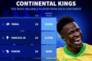 体育资讯8月23日讯 德国转会市场列出了各大洲身价最高的球员,以及各大洲的球员总身价。
